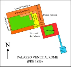 Between 1466–1469,[4] Pope Paul II added at the south-east corner a large square three storied cloister enclosing a garden, which structure was known as the Viridarium ("Green Area") or Palazzetto ("Little Palace"). The building was completed after the pope's death in 1471 by his nephew Marco Barbo, Patriarch of Aquileia.[5] This structure was demolished in 1910 and rebuilt on a similar scale and reusing many original materials, 100 metres to the west to fit in with the construction of the massive Victor Emmanuel II Monument on the Capitoline Hill, scheduled for completion in 1911.