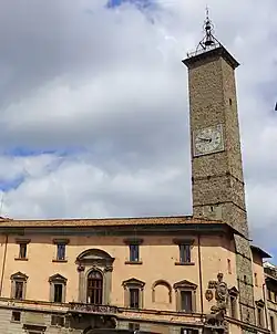 This palace has a tall stone bell-tower (Torre del Orologio formerly Torre dei Monaldeschi) rising behind it; the tower at about its midpoint has a clock, first added in the 15th-century. The largest bell in the tower derives from the church of Santa Maria della Verita. Diagonally across the piazza is the church of Sant'Angelo in Spatha, which has a marble replica of the Ancient Roman Sarcophagus of Bella Galiana on the facade.