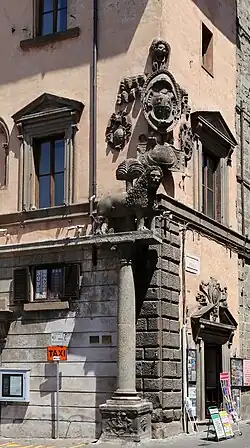 On the south corner of the piazza facade are a series of heraldic shields and a column with a lion and palm tree, symbols of Viterbo. Across the Piazza is the baroque Palazzo della Prefettura which also has a lion atop a column on the southern corner of the facade. This medieval lion sculpture was once in the Palazzo del Priori on the main stairs.