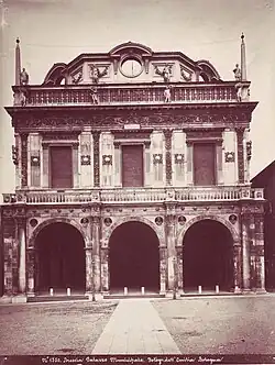 The three arches facing the Piazza della Loggia were Filippo Grassi's contribution from 1492, supporting the frontal loggia.[4]