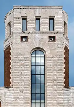 The main facade, about 20 meters high, is divided into three parts, highlighted by a monumental portal with a lintel supported by Ionic columns and topped by the marble group of Maremma Domata ("Tamed Maremma") by Napoleone Martinuzzi. A prominent elliptical tower, containing the main staircase, serves as a visual and functional hinge between the wings. The tower's verticality is accentuated by a central window illuminating the staircase and directing attention to small clock openings below the windowed loggia at the top.[4][5]