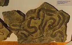 A cyanobacteria, member of the family Oscillatoriales. Girvanella is almost rock-forming in the lower and upper levels, and is very common, but can only rarely be detected in the bituminous clay marl slate due to preservation reasons.[27] |