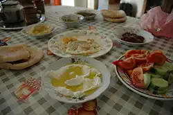 Jibneh Arabieh or jibneh baida is a white table cheese served with any of the above dishes.[8] Ackawi cheese is a common variation of jibneh baida. Ackawi cheese has a smoother texture and a mild salty taste.[26] It originated in the city of Akka (Acre)—hence the name Ackawi—in the Galilee. Labaneh is a pasty yogurt-like cream cheese either served on a plate with olive oil and za'atar—which is generally called labeneh wa za'atar—or in a khubz sandwich.[8]