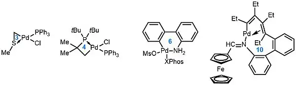 The palladacycles could also be classified by the donor atoms. For example, the Herrmann’s catalyst discussed before is a phosphine-derived palladacycle. Other types of palladacycles such as phosphite palladacycle, imine palladacycle, oxime palladacycle, CS-/CO-palladacycles are also effective in catalytic reactions. Palladacycles derived from 2-aminobiphenyl have been used in a variety of cross-coupling reactions.