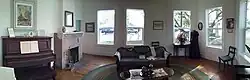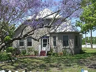 The house was a kit house model purchased from Sears, Roebuck and Co., built by Thomas W. Hartley between 1914 and 1919, on property bought by his father, James Hartley, around 1880.[1] The house was built on a reinforced concrete foundation with rusticated concrete block construction, which was poured on-site, made with sand from a nearby scrub.[2] The outside surfaces of the blocks were cast to simulate a stone finish. Each block weighed 84 pounds, and the blocks were joined with pink mortar.[3] A hall ran the length of the downstairs; walls were reinforced concrete to provide bearing support for the second floor. The upstairs rooms were never completed by the family due to a shortage of funds, leading neighbors to joke that the house was perpetually "under construction."[4][5] The house was not wired for electricity until 1947.[4]