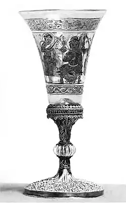 The original object was a glass beaker, transformed into a goblet with an elongated stem in France.[3] The glass is Islamic work, perhaps made at Mosul, Damascus, or in Egypt, in the early thirteenth century. The decorated glass beaker itself can be securely attributed to the Jazira area of northern Iraq and northern Syria, probably to Raqqa or Aleppo, where major glass workshops operated, and can be most likely dated to the period between 1200 and 1225.[1]