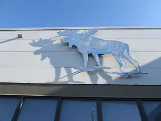 Photo of the iconic blue moose outside the entrance to Palmer High School