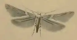 The wingspan is about 11 mm.[2] The forewings are pale olive grey, a little darker posteriorly. Before the middle is an oblique whitish fascia, nearest the base of the wing on the inner margin, the whitish colour of this fascia runs along the edge of the costa and inner margin to the middle of the wing. Beyond the middle is a whitish blotch not reaching to the costa, and intersected by two dark olive-grey veins. The apex of the wing is whitish, streaked with grey. The hindwings are pale grey.[3]