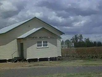 Pampas Memorial Hall is at 6179 Gore Highway (27°47′29″S 151°24′39″E / 27.7913°S 151.4108°E).[13][14]