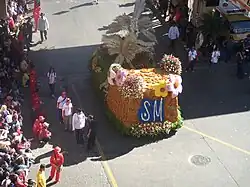 The Panagbenga Festival (Kankanaey pronunciation: [pʌnʌɡ̚ˈbɨŋʌ]; Ilocano pronunciation: [pɐnɐgˈbɯŋa]), also called the Baguio Flower Festival, is a month-long annual flower occasion in Baguio, Philippines. The festival, held in February, was created as a tribute to the city's flowers and as a way to rise from devastation of the 1990 Luzon earthquake.[1] The festival includes floats that are covered mostly with flowers. The festival also includes street dancing, presented by dancers clad in flower-inspired costumes, that is inspired by the Bendian, an Ibaloi dance of celebration that came from the Cordilleras.