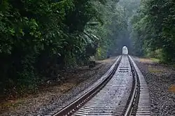 Upon completion the railroad stretched 47 miles, 3,020 feet (76 km), with a maximum grade of 60 feet to the mile (11.4 m/km, or 1.14%). The summit grade, located 37.38 miles (60.16 km) from the Atlantic and 10.2 miles (16.4 km) from the Pacific, was 258.64 feet (78.83 m) above the assumed grade at the Atlantic terminus and 242.7 feet (74.0 m) above that at the Pacific, being 263.9 feet (80.4 m) above the mean tide of the Atlantic Ocean and the summit ridge 287 feet (87 m) above the same level.[20][21] The gauge was 5 ft (1,524 mm) in 53 lb/yd (26 kg/m), Ω-shaped rail. This gauge was that of the southern United States railway companies at the time. This gauge was converted to standard in the United States in May 1886 after the American Civil War, and remained in use in Panama until the railroad was rebuilt in 2001.[22]