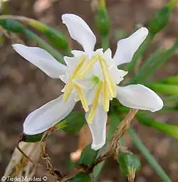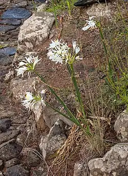 Pancratium canariense or the Canary Sea Daffodil is a species of bulbous plant endemic to the Canary Islands. It grows on north facing slopes in good light, not exposed to hot burning sun and not baking drought. It grows in fertile soil between rocks and shrubs. It flowers in the early autumn. The name canariense means "from the Canary Islands".