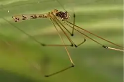 Panjange is a genus of leaf-dwelling spiders in the family Pholcidae, widely distributed in the islands of Southeast Asia from Borneo and the Philippines to northern Australia. Panjange spiders exhibit some of the most extraordinary morphology among Pholcidae. Males of most species have eye stalks, sometimes with long pointed processes; males of some species have unusually elongated pedipalps, which in spiders function as copulatory organs; and females of some species have external portions of their genitalia strongly folded and extensible. The biological significance of these sexual modifications remain unclear.[1]