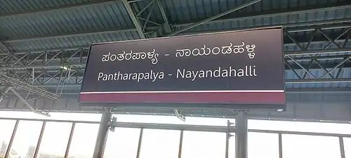 Pantharapalya - Nayandahalli (formerly known as Nayandahalli) is an elevated metro station on the East-West corridor of the Purple Line of Namma Metro serving the borders of Banashankari and Mysore Road along with Bangalore University campus in Bengaluru, India. It was inaugurated on 29 August 2021 and opened to the public on 30 August 2021.[1][2]