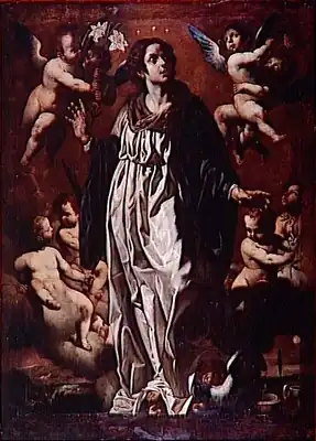 He painted extensively in 1620–1626 in the Certosa di San Martino in Naples. He painted a Baptism of St Celsus (c. 1635) for the Pozzuoli Cathedral. He also painted a number of Immaculate Conceptions, including versions in San Lorenzo Maggiore of Naples; in the Annunziata of Airola; in the church of San Francesco in Montesarchio; and in the Palais des Beaux-Arts in Lille,[1] as well as a Virgin with saints Margaret, Bernard & Anthony of Padua (1634) for the church of Santi Bernardo e Margherita a Fonseca in Naples, and an Annunciation and Bride of the seven canticles for the church of the Annunziata at Airola.