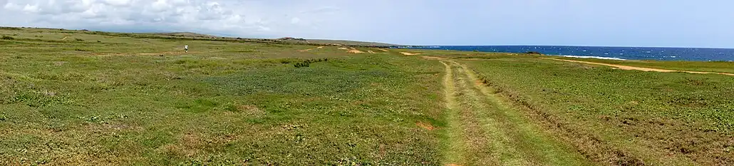 The beach is located about 3 miles (5 km) east of Ka Lae (known as South Point) on the island of Hawaiʻi.[17] It is surrounded by pasturelands and is only legally accessible by foot. The paths are rugged due to both illegal vehicular traffic and erosion. The land owner, the Department of Hawaiian Home Lands,[18] has attempted to restrict vehicular traffic in the area since 2016. However, illegal vehicular traffic has continued despite the measures. The vehicles have created ruts in the soil that reach well over 8 feet deep as shown in the photo below from December 20, 2020.