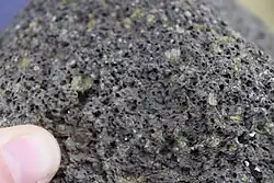 The fragmented volcanic material (pyroclastics) of the tuff ring contains olivine, a silicate mineral containing iron and magnesium, also known as peridot when of gem quality. Olivine is a common mineral component of lava and is one of the first crystals to form as magma cools.[9] Olivine is locally known as "Hawaiian Diamond" and is notably found in Oʻahu's famous Diamond Head landmark.[10] The source of the green coloration of the beach sands is due to the olivine crystals (whose green color is due to ferrous iron) which are winnowed from the eroding headland by the action of the sea. Olivine, being denser than the enclosing ash matrix, tends to accumulate on the beach whereas the less dense volcanic sand is swept out to sea.[11][12] Elsewhere on the Big Island, olivine is enclosed in lava rock, rather than volcanic ash, so the olivine is not easily freed from the enclosing rock and tends to weather away rather than accumulate and concentrate as beach sand.
