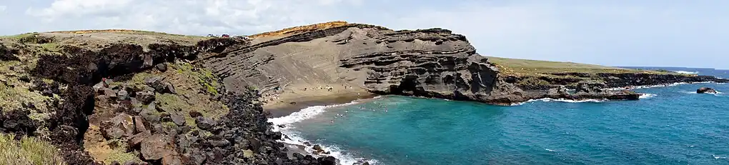 The formation of the tuff ring is currently a point of contention, with some arguing that lava flowing into the sea was suddenly cooled, forming an edifice on the coastline (a littoral cone) and others noting that the cone was most likely too far away from the ocean at the time of formation (sea level was much lower during the last Ice Age, when the cone formed) to make such an event possible.[5] Regardless of how it was formed, according to the United States Geological Survey, the last lava flow in the area ended over 10,000 years ago, making the area one of the more stable features in the geologically turbulent Kaʻū region.[14] As such, the geologic history of the site can be seen in the rock surrounding the beach and bay, which are not subject to erosion and thus display geologic layers formed by previous eruptions, lava flows, and other volcanic events.[15] In addition, the current patterns of erosion can be seen first-hand, as only the portions at the bottom of the tuff ring collapse have been subject to the waves and turned into green sand; the remaining portions appear gray.[16]