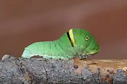 The caterpillar is large and green with an enlarged head. It has four yellow dots and two false eyes with bluish centers. In profile, this caterpillar appears snake-like. The immature larvae are brown and white to mimic bird droppings, making them unappealing to predators.