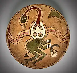Paracas ceramics is distinguishable from the Topará culture and Paracas-Nazca transition as a result of the difference in the slip used to create and decorate the ceramic pieces.[5][6] The Topará ceramic style is dominated by monochromatic designs, often decorated with an orange or neutral color clay slip.[12] Nazca ceramics involved a focus on polychrome designs accomplished through the application of a slip consisting of clay and pigments obtained from minerals like manganese found in their environment.[13] The Paracas ceramic style involved the application of a clay based slip before firing the polychrome ceramic pieces.[14][5] Though the Paracas culture often employed post-fire painting, a technique that involves markings and decorations through the application of resin and pigment to produce the colorful pieces that set apart Paracas from the Topará and Nazca.[14] Alongside the culturally significant polychrome aspect of Paracas ceramics, this culture involved geometric, zoomorphic, and anthropomorphic foci with evidence of an abstract style.[14] Paracas ceramics had abstract forms, showing architectural features through the configuration of form and imagery of Paracas ceramics to illustrate cultural and historical aspects of the Paracas culture.[15]