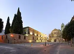The Úbeda Parador's original building was built of stone in a classical Renaissance style, typical of Úbeda and the neighbouring town of Baeza.[6] It had an almost rectangular layout on two floors surrounding a spacious central courtyard.[7] The southern frontal façade onto the Plaza Vázquez de Molina is simple and restrained[8] with a marked horizontal nature and symmetry. It rests on a prominent base with small windows to the sub-basement and iron rings for tethering horses. The main façade displays two series of six window openings, crowned on the lower floor with triangular pediments and on the upper floor with mannerist features. The principal door is almost in the centre (being slightly offset towards the west), the steps up to the level of the central patio framed by Doric columns on which two female figures with wings support a coat of arms.[7] Two further windows at each corner of the upper floor are designed in a detail typical of the Hispanic-Renaissance period in Úbeda, their balconies each supported in the centre by a white marble column. They opened from the two finest rooms in the palace. The façade is crowned by a pronounced corbelled cornice with a frieze of large egg-and-dart ornamentation.[1][9]