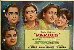 Pardes (transl. Foreign land) is a 1950 Indian Hindi-language romantic drama film directed and written by M. Sadiq.[1] Starring Madhubala, Rehman, Karan Dewan and Shakuntala, the film tells the story of Rajan, a teacher, who falls in love with a wealthy girl named Chanda but decides to go away from her to earn money.[2]