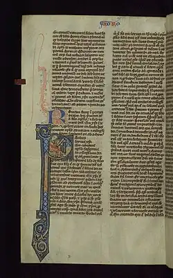 Paris Bible is the name given to bibles produced by scribes mainly in Paris and areas of Northern France although examples are believed to have originated in England and Italy.[3] However, scholars caution that the term is used too broadly as it is often confused with the 'pocket bible'[4] which is applied to bibles produced from the 12th century onwards. These were small enough to be carried in a saddle or travelling bag or indeed a pocket.[5]