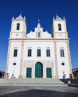 The Parish Church of Our Lady of Purification is constructed of lime and stone masonry. The church covers 1,817 square metres (19,560 sq ft), is 29 metres (95 ft) high, and has two stories. The façade has three portals, a monumental pediment, and is flanked by bell towers on both sides. The church was once surrounded by an iron railing, but now has a broad, circular staircase that surrounds the front and sides of the building. The portals are in lioz limestone imported from Portugal in the style of a triumphal arch, similar to that found in the parish church in Maragogipe. Three windows at the choir level, with two windows at the same level in the bell towers. The windows of the bell tower have oculi below. The pediment has volutes and central niche with an image of Our Lady of Purification.[1][2][3][4]
