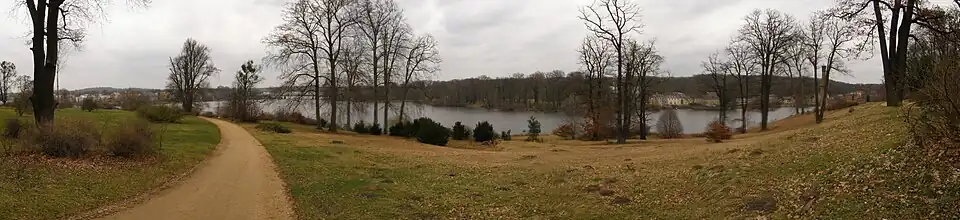 Babelsberg Park (German: Park Babelsberg) is a 114 hectare park in the northeast of the city of Potsdam, bordering on the Tiefen See lake on the River Havel. The park was first designed by the landscape artist Peter Joseph Lenné and, after him, by Prince Hermann von Pückler-Muskau and Karl Friedrich Schinkel,[1] by order of the then-prince William I and his wife, Augusta. Located on a hill sloping down to the lake, the park and castle are part of the Palaces and Parks of Potsdam and Berlin, which were inscribed on the UNESCO World Heritage List because of their unique architecture and testimony to the development of landscape design.[2]