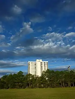 Pacific Towers viewed from York Street Playing Fields, with the site of the stalled $13 million, 9 storey Beaches high rise development[3] visible to the right.