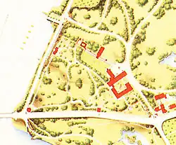 Elliptical and round flower beds with terracotta palmette borders are typical for garden courtyard and pleasure ground. The restoration was supported by discovering original border stones in the cellar of the Curiosity pavilion.[12] In the underground the beds are walled in allowing for specific irrigation, therefore the pleasure ground has been crisscrossed with water pipes. As the clay pipes on Peacock Island lasted only ten years after being installed in 1824 expensive iron pipes supplied by the Prussian industrial pioneer F.A. Egells (de) were installed in Glienicke when in 1838 the pumping station started operating with a steam engine, a gift by Charles’ father which was also manufactured by F.A. Egells.[5]: 202  The beds were filled with a loose subsoil which facilitated the quick replacement of plants. There are some figurative designed beds bordered with buxus which add to the pleasure ground an artificial aspect, e.g. the Oak Leaf bed near the Lions Fountain and the Diana(Greek:Artemis) or Pliny bed at the Casino. An Athena statue, which is now at the British Museum, stood in a niche on the northside of the Casino characterizing it as a place of art. Most striking is the Lilies bed beneath Charles' bedroom windows at the western facade of the palace. It is a heraldic sign referring to Charles' younger sister Louise who was married to Prince Frederick of the Netherlands. She was very supportive sending bulbs to Charles. In Glienicke planting of roses has been almost non-existent in contrast to Babelsberg Park and Peacock Island. The pleasure ground in Glienicke is rather a portrayal of an antique villa complex as described by Pliny the Younger than a reflexion on a longing for Italy(Italiensehnsucht).