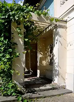 The pavilion named Curiosity dates back to 1796 and was rebuilt in strict Doric order by Schinkel in 1825. It has a cellar.[13]: 36  Its name derives from the fact that it could be used to watch the traffic on the adjacent Berlin-Potsdam chaussee through the shutters while being invisible to passers-by. Around 1848 the pavilion became a place for arts collection. Spolia were inserted in the entrance hall. At the same time a Florentine Renaissance arcade was installed as a cover on the garden façade. Already in 1842 the arcade was bought from the Russian arts collector Anatoly Demidov who lived in Florence.[14] : 78
