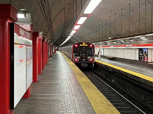 Park Street station is an MBTA subway station in Boston, Massachusetts. It is located at the intersection of Park Street and Tremont Street at the eastern edge of Boston Common in Downtown Boston. One of the two oldest stations on the "T" (the other is Boylston), and part of the oldest subway line in the United States,[2] Park Street is the transfer point between the Green and Red lines, as one of the quartet of "hub stations" on the MBTA subway system. Park Street is the fifth-busiest station in the MBTA network, with an average of 16,571 entries each weekday in FY2019.[1]