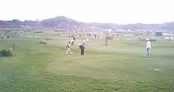 Park golf uses terminology similar to golf, utilizing words such as par, bogey, eagle and double eagle.[5] To formally play a game of Park Golf, two to four participants are required to form one group. Order is decided by drawing rods that are generally provided by the course management at the beginning of each course. Once initial shooting order is determined, the group decides which course to play on as most parks have 2-4 courses, one course being 9 holes. Multiple courses can be played. Holes can be shot in any order, as long as all holes are played eventually. This occurs most commonly due to a quick group advancing on a slower group of park golfers.
