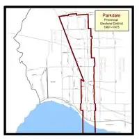 Prior to the 1967 election, a major redrawing of the boundaries took place in 1966. Parkdale's northernmost boundary was the city limits with The Borough of York, starting south of Lavender Road, through the northern side of Rowntree Avenue, continuing just north of Innes Avenue, to its eastern border through Prospect Cemetery. The boundary then went southwards from a point starting across the street from Morrison Avenue on Harvie Avenue. The eastern border went down Harvie until it turned east at St. Clair Avenue West, going as far as Greenlaw Avenue. It then went south on Greenlaw until Davenport Road. The boundary continued south along Primrose Avenue until the east-west C.P.R. railway tracks. It then continued south along Emerson Avenue until it reached Wallace Avenue. It went east along Wallace until Brock Avenue. It then continued south along Brock Avenue all the way to Queen Street West, where it went eastward for a block, then went down the western side of Elm Grove Avenue toKing Street West. The boundary then jogged west along King for about a block to Spencer Avenue. It then went south all the way to Lake Ontario. The western boundary started on the lakefront, at approximately a point 250 metres directly south of Dowling Avenue. It went north along Dowling until King Street West. It jogged slightly west and continued north along Beatty Avenue to Queen Street West. A short jog east along Queen before continuing north along Sorauren Avenue to Dundas Street West. It went east along the southern side of Dundas to the C.N.R./C.P.R. tracks. The boundary followed the C.N.R. tracks in a north-westerly direction up to the old York-Toronto city limits.[11][12]