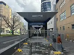 An unwrapped station entrance signage near the main and eastern entrance on Grattan Street, September 2024 -