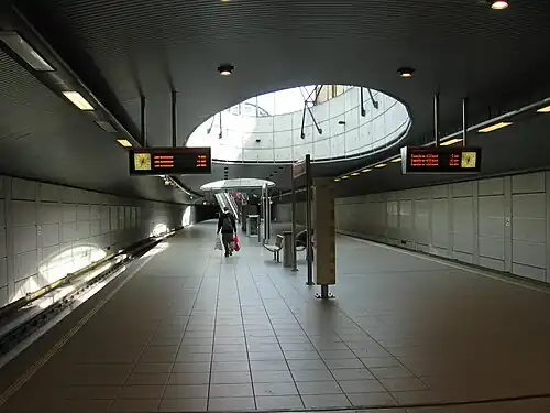Parkweg is an underground subway station in the Dutch town of Schiedam, located just west of Rotterdam. The station is part of Rotterdam Metro line C and was opened as a result of an extension of the East-West Line (also formerly called Caland line) which opened in November 2002. This extension connected the former terminus Marconiplein to the North-South Line (also Erasmus line) at Tussenwater station.