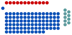 The Parliament of Singapore is unicameral – all Members of Parliament (MPs) make up a single chamber, and there is no senate or upper house. At present, the effect of the Constitution of Singapore and other legislation is that there can be a maximum of 105 MPs. Members of Parliament are elected by the people while up to 12 Non-constituency Members of Parliament (NCMPs)[29] and up to nine Nominated Members of Parliament (NMPs) may be appointed.[30] After the 2025 general election, 97 MPs were elected[31] and two NCMPs were appointed (or, in the terms of the Parliamentary Elections Act,[32] declared elected) to Parliament.[33]