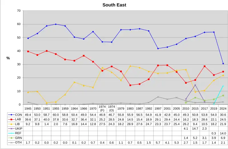 The region[1] of South East England is divided into 91 parliamentary constituencies, which are made up of 27 borough constituencies and 64 county constituencies. Since the general election of July 2024, 35 are represented by Labour MPs, 30 by Conservative MPs, 24 by Liberal Democrat MPs, 1 by a Green MP, and 1 by an independent MP.