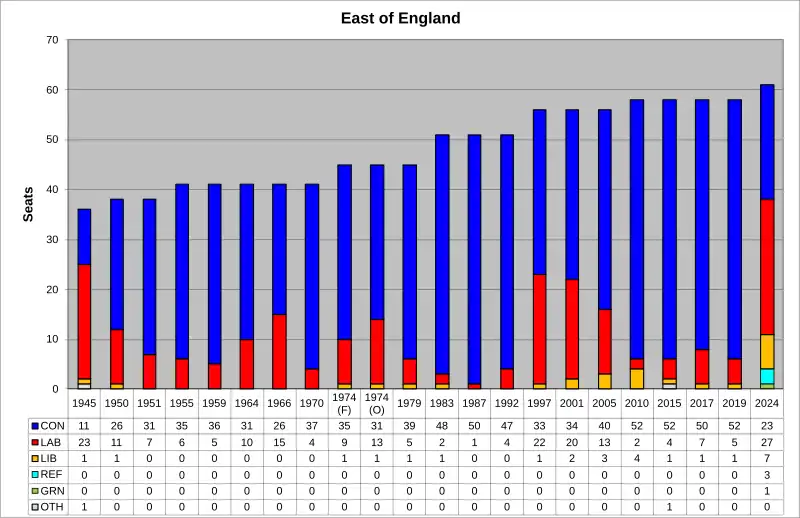 The region[1] of the East of England is divided into 61 parliamentary constituencies which is made up of 14 borough constituencies and 47 county constituencies. Since the general election of July 2024, 27 are represented by Labour MPs, 23 by Conservative MPs, seven by Liberal Democrat MPs, three by Reform UK MPs, and one by a Green MP.