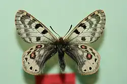 Parnassius huberi is a high-altitude butterfly which is found in Tibet. It is a member of the snow Apollo genus (Parnassius) of the swallowtail family (Papilionidae).