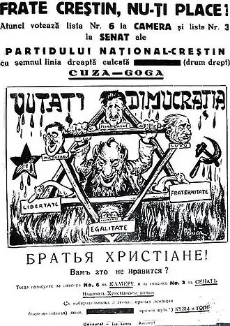 The party's stances evidenced Goga's conversion to antisemitism, which he had not explicitly embraced before 1932; within that framework, Goga was arguing that Jews were endorsing "Magyarization" in Transylvania.[57] However, already in the 1910s Goga was modelling himself on Karl Lueger, Cisleithania's antisemitic doctrinaire;[58] Lueger's influence also reached directly to other PNA affiliates, including Boldea.[10] In the 1920s, Goga's Țara Noastră had expressed sympathy with the growing antisemitic trend among students, and indirectly with the Iron Guard.[59] In Mustul care fierbe, Goga further hinted that Jews were to blame for the ills of modernity.[60] He voiced alarm about Greater Romania being invaded by "parasites" and "guess... who". However, he framed his support for the students in terms of social rejuvenation, and noted that violent antisemitism was perhaps an "incorrect slogan".[61] During the elections of 1926, Goga, as Minister of the Interior, had obtained favors for A. C. Cuza's National-Christian Defense League (LANC), which was virulently antisemitic. However, his assistance proved a moderating influence, obliging Cuza to purge the LANC of radicals such as Ion Zelea Codreanu, Valer Pop, and Traian Brăileanu.[62]