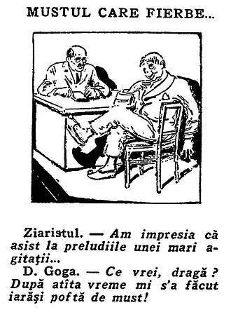 While commenting on Goga's political duplicity, Carandino argued that he "was just as ready to serve the monarchy, the [National] Liberals, [the Jewish businessman] Aristide Blank, or anyone else who would have hired him."[63] In 1931, Goga was still reassuring his readers that he was not an antisemite.[64] According to Minuț, his subsequent drift was a consequence of his taking money from antisemitic industrialists, and in particular from Ion Gigurtu.[65] Xenophobic radicalization was additionally enhanced by the PNA–PNȚ conflict: Goga castigated his adversaries for their alleged grafting during the "Škoda Affair", which had profited the Polish industrialist Bruno Seletzky. However, Minuț notes, Goga was "contradictory" even at this late stage, sometimes stating his belief in the minorities' integration, but often decrying their participation in public life.[66]