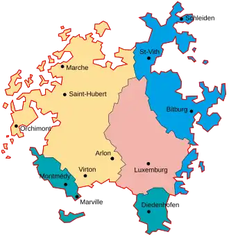 The Second Partition reduced Luxembourg's territory by 2,280 km2 (880 sq mi), or 24% of Luxembourg's contemporary area. Along with Bitburg, Prussia gained the towns of Neuerburg, Sankt Vith, Schleiden, and Waxweiler (previously the County of Schleiden, the Herrschaft Kronenburg, the County of Vianden and the Provosty of Bitburg). Altogether, the lands had a population of 50,000.[1] Today, these lands belong to both Germany and Belgium; the district of Eupen-Malmedy was ceded by Germany to Belgium in 1919 under the Treaty of Versailles.