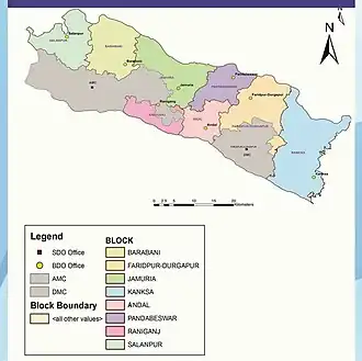 The district comprises two subdivisions: Asansol Sadar subdivision and Durgapur subdivision. In Paschim Bardhaman district, there are 8 CD block under two subdivision. In Asansol Sadar subdivision, there are 4 CD block - Salanpur, Barabani, Jamuria and Raniganj. In Durgapur subdivision, there are 4 CD block - Andal, Pandabeswar, Faridpur-Durgapur and Kanksa.[15][16]