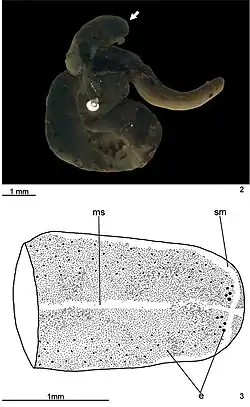 Pasipha ferrariaphila has an elongate body with parallel margins, a rounded front tip, and a pointed back tip, around 22 mm in length. The dorsum is a homogeneous dark brown color, which is pigment covering a light brown base, visible under a microscope as a thin median stripe. The ventral side of the body is pale yellow.[2]