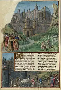 The Passages d'outremer is conserved in three 15th-century manuscripts, all today in the Bibliothèque nationale de France (BnF), numbers fr. 5594, fr. 2626 and fr. 4769. A partial edition was printed at Paris by Michel Le Noir in 1518 under the title Les passaiges d'Oultremer faitz par les Françoys.[1] The manuscript BnF fr. 5594 is a masterpiece of manuscript illumination by Jean Colombe, containing 66 full-page miniatures.[3][4] It was finished after 1488, since it contains a copy of a letter from the Ottoman sultan Bayezid II to King Charles VIII of France dated to that year.[5]