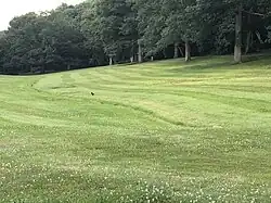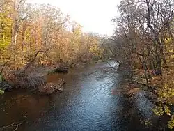 The Passaic River rises in the center of Mendham, in southern Morris County. According to Google Maps the river begins at Dubourg Pond located on private land between Spring Hill Road and Hardscrabble Road.[5] This pond is fed by a very small stream that begins from a spring located approximately 1000 feet south west of the pond at the bend in Spring Hill Road.[6] This spring is the likely true headwater of the Passaic River. Leaving Dubourg Pond the river travels northeast and crosses Corey Lane before entering the Buck Hill Tract Natural Area. However At this point, the river begins to generally flow south, through Morristown National Historical Park, and forms the boundary between Morris and Somerset counties. In its current path, it passes through the southeast edge and drains Lord Stirling Park then along the western edge of the Great Swamp, which it drains through several small tributaries including Black Brook. The river passes through a gorge in Millington and then turns abruptly northeast, flowing through the valley between Long Hill to the west and the Second Watchung Mountain to the east.