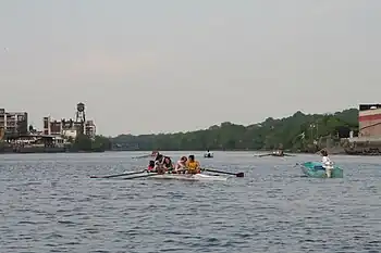 Oarswomen from Nutley High School and their coach working out in the Passaic River at Newark