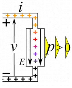 To comply with the convention, the direction of the voltage and current variables used to calculate power and resistance in the component must have a certain relationship: the current variable must be defined so positive current enters the positive voltage terminal of the device.[3] These directions may be different from the directions of the actual current flow and voltage.